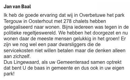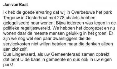 Van Baal (VB) was wethouder en projectleider in de tijd dat Tergouw gereed werd gemaakt voor permanente woonbestemming. Zowel uit de notulen van alle gesprekken uit die tijd als bevestigd door voormalig raadslid Eefting, zie 218 punt 1, blijkt dat de raad buitenspel was gezet. Het was VB die het wel eventjes zou regelen. Dit is volledig mislukt, ondanks zijn eigen borstgeroffel. VB negeerde contractuele voorwaardes tussen de gemeente en de beheerder om onverklaarbare redenen. De beheerder had grondsanering moeten uitvoeren volgens het bestemmingsplan en de nutsnetwerken dienen te vernieuwen volgens het exploitatiecontract. Dit is allemaal niet gebeurt en nu wil de beheerder de benen nemen en de bewoners achterlaten met vervuilde grond en aftandse nutsnetwerken. Dat VB er nu nog steeds niets van snapt blijkt uit het feit dat er geen 278 chalets maar maximaal 256 kunnen zijn. Van Baal zegt dat “we” het hebben doorgezet. Onder die “we” vallen niet de bewoners, omdat de afspraken met bewoners uit de notulen niet zijn nagevolgd. VB zegt dat dwarsliggers de servicekosten niet willen betalen, dan gaat VB voorbij aan het feit dat servicekosten onder vaste rechtspraak c.q. dwingend recht vallen waarop geen winst gemaakt mag worden. Dit is bevestigd door de rechter in het AV2000-vorderaars proces. Wellicht bedoelt VB dat sommigen de beheervergoeding niet (volledig) betalen na gerechtelijke uitspraken en ingebrekestellingen. Dankzij VB zijn de kavels van Tergouw flink in waarde gestegen, terwijl nieuwe netwerken er nog steeds niet liggen!