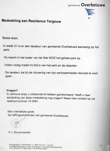 Er hangt een brief van de gemeente bij de postvakjes waarin staat dat er een WOZ-onderzoek aan de gang is. Bij monde van de ambtenaar ter plaatse gaat de gemeente de onroerende zaakbelasting (OZB) verhogen. Het is wel ironisch dat de gemeente juist méér geld bij de bewoners komt halen, terwijl de gemeente medeverantwoordelijk is voor de aftandse infra-voorzieningen en de financiële schade daarvan. Deze ambtenaar wist verder niets te vertellen over de stand van een eventueel ‘gemeentewoonwijkje’. Een bewoner aan de stoffige grindringweg besloot een grap te maken door “Tergouw vies” op zijn autoruit te schrijven alvorens de ambtenaar een foto nam van zijn woning. De bewoner stelt dat 3 jaar geleden de beheerder nog met een zuigmachine over de grindwegen reed om het stof weg te halen en dat deze machine nu ongebruikt in de loods staat.