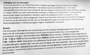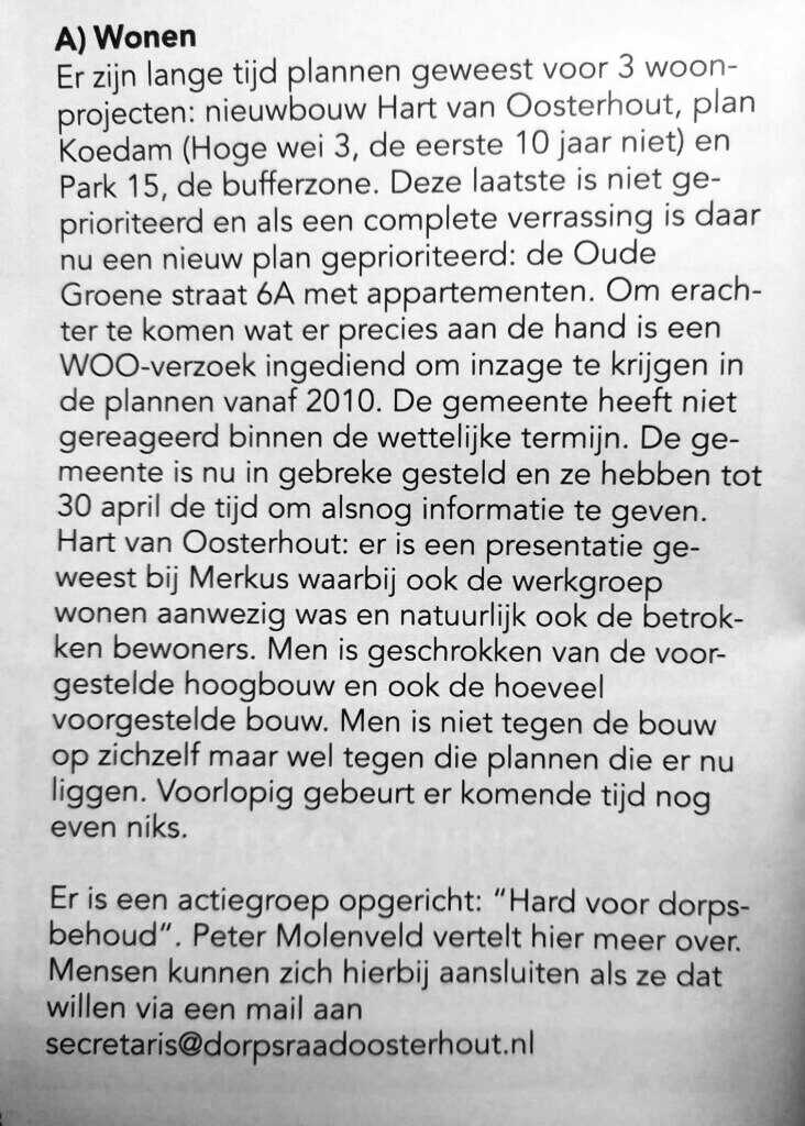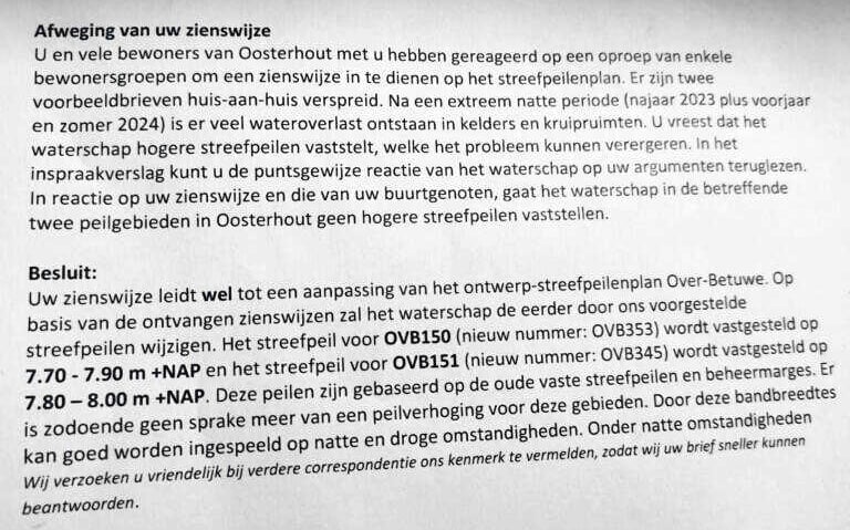 In 200 stond dat het Waterschap voornemens was het grondwaterpeil in Over-Betuwe te verhogen en wat de nadelen daarvan voor het park zouden zijn. Gelukkig heeft het Waterschap op 4-6 een brief gestuurd waarin deze beslissing ongedaan gemaakt is. Het initiatief van De Dorpsraad en werkgroep Oosterhoutse Waarden om als groot collectief bezwaar te maken met een voorbeeldbrief was slim opgezet en goed uitgevoerd. Zo ziet u maar wat er mogelijk is als burgers samenwerken. In 257 staat een initiatief om als bewoners samen te werken om de beheerder te dwingen nieuwe nutsnetwerken aan te leggen. Wie weet.
