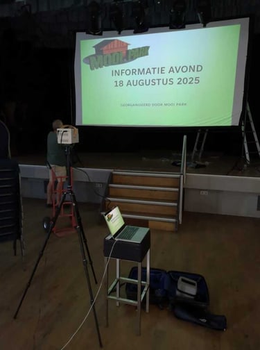 De bewonersavond van 1808-2025 zit vol. De datum van de 2e bijeenkomst is 01-09-2025, 19.30u in De Schakel. Uit de testpresentatie van 266 bleek dat een open dialoog tussen 6 bewoners al te chaotisch werd. Een rustige, ordentelijke avond in een bomvolle zaal kan alleen goed verlopen met schriftelijke vragen zonder onderlinge, lange, emotionele discussies. Op iedere sheet wordt de bron vermeld zodat de inhoud controleerbaar voor u is. De presentatie bestaat uit 4 delen. Na elk deel is er 5 minuten de gelegenheid om uw vragen op te schrijven. Aan het einde van de presentatie volgt een handtelling wie er iets voor voelt om mee te gaan in het voorstel. U zit nergens aan vast. Het is een indicatie of een 3e avond organiseren met advocaat en kostenplaatje erbij zin heeft. Na de handtelling worden de schriftelijke vragen beantwoord. Wat qua tijd niet lukt om te beantwoorden, komt op de site. Het is niet mogelijk om aan een ‘op en neer’ dialoog tussen het podium en de zaal te beginnen. Laten we dat bij 1 iemand toe, dan wil de rest van de zaal ook en daar is geen tijd en ruimte voor met een volle zaal. Wie graag een polemiek wil of een open brief wil plaatsen op de site kan na afloop mailen naar info@stichtingmooipark.nl. Het is onmogelijk om het iedereen perfect naar de zin te maken. MP komt met een parkbreed voorstel tot een oplossing. Op details individueel afwijken gaat niet. Het is een pakketdeal waar iedereen ja of nee tegen kan zeggen. Hieronder een foto van gisteren toen de techniek getest werd in De Schakel.