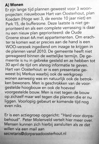 In Dorpsgeluiden juni 2025 staat een verslag van de Dorpsraad van 23-04-2025 waaruit blijkt dat Tergouw wordt voorgetrokken bij besluitvorming door de gemeente. Uit het niets kreeg Tergouw ineens prioriteit om woningen te bouwen op en rond de af te breken sportschool. De Dorpsraad snapt dit niet en is een onderzoek begonnen. Het is dus niet alleen de oude garde bewoners die zegt dat Tergouw op onverklaarbare wijze zich niet aan de afspraken uit het bestemmingsplan en exploitatiecontract met de gemeente hoeft te houden en daardoor blijkbaar een bevoorrechte positie heeft. Hieronder kunt u zelf lezen wat de Dorpsraad zegt over het Tergouw mysterie.